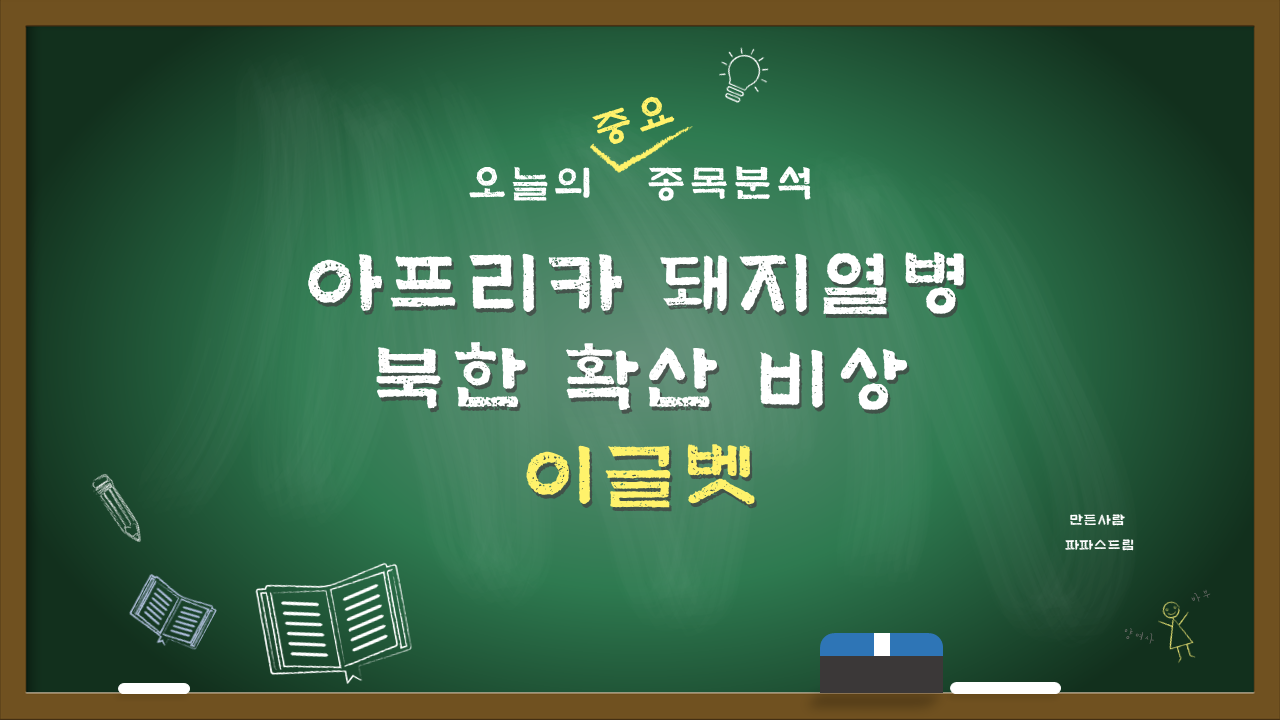 안녕하세요, 파파스드림입니다. 오늘은 북한 아프리카 돼지열병 확산 소식으로 상한가를 기록한 이글벳의 주가 전망에 대해 알아보도록 하겠습니다.