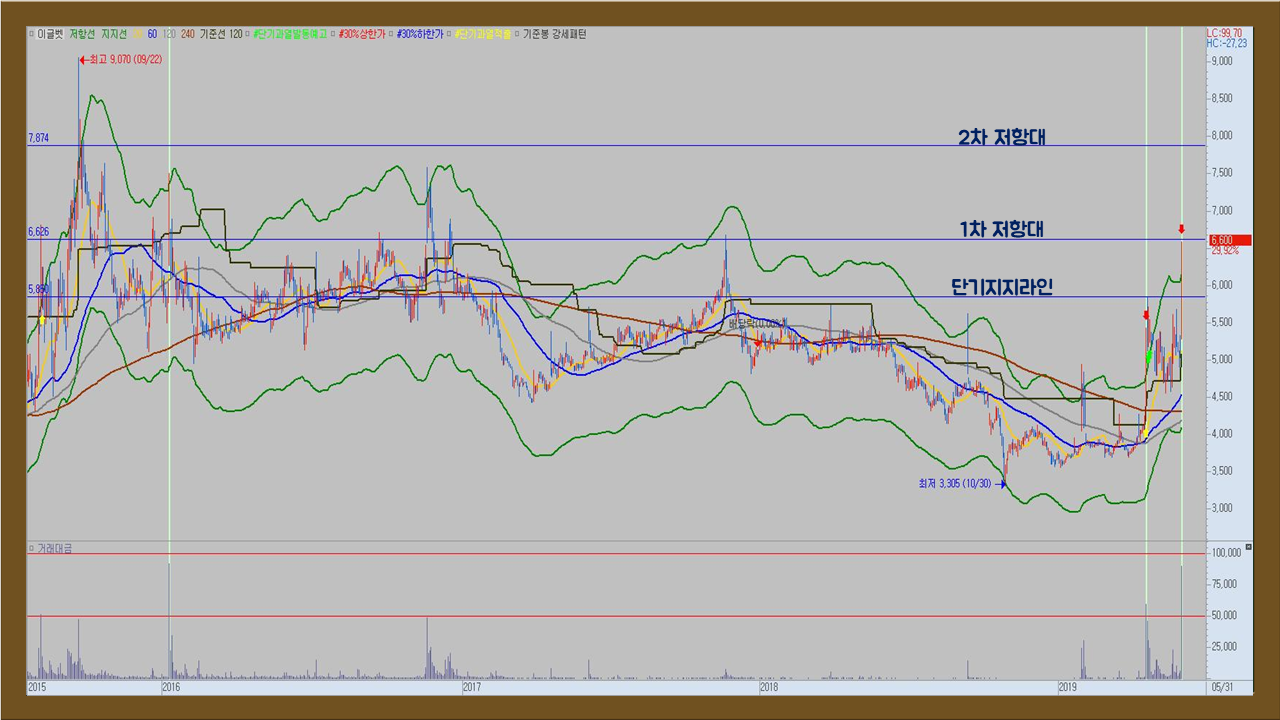 동물의약품 혹은 동물사료 주들이 전반적으로 오랜 기간 기간조정과 가격조정을 진행하였습니다. 이글벳의 주가 역시 가격조정과 기간조정을 진행 끝이 이번 아프리카 돼지열병 관련 호재로 상승하고 있는데요. 제 주관적인 의견으로는 2차 저항대 부근까지는 이글벳의 주가가 무난하게 상승하지 않을까 생각해봅니다.