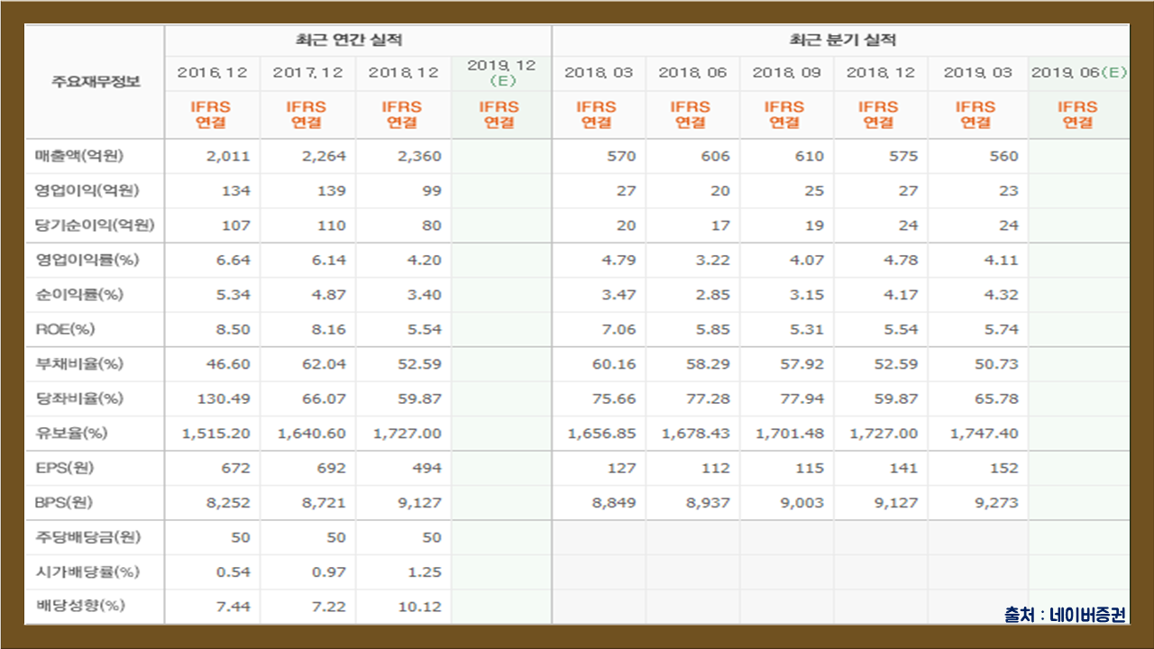 DSR의 재무정보입니다. 전년도 기준 매출액은 2360억원, 영업이익은 99억 원, 당기순이익은 80억 원을 기록하였습니다. 유보율 1727% 대비 부채 비율은 52.59%로 재무안정성은 아주 우수한 편입니다.