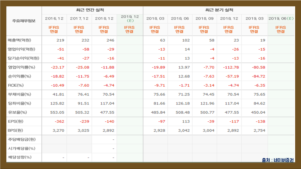 에프알텍의 재무정보입니다. 전년도 매출액은 246억원, 영업이익은 -29억 원, 당기순이익은 -16억 원으로 3년 연속 적자를 기록 중에 있습니다. 올 1분기 매출액은 19억 원, 영업이익은 -15억 원, 당기순이익은 -16억 원으로 이 추세로 가면 4년 연속 적자를 기록할 가능성이 높습니다.