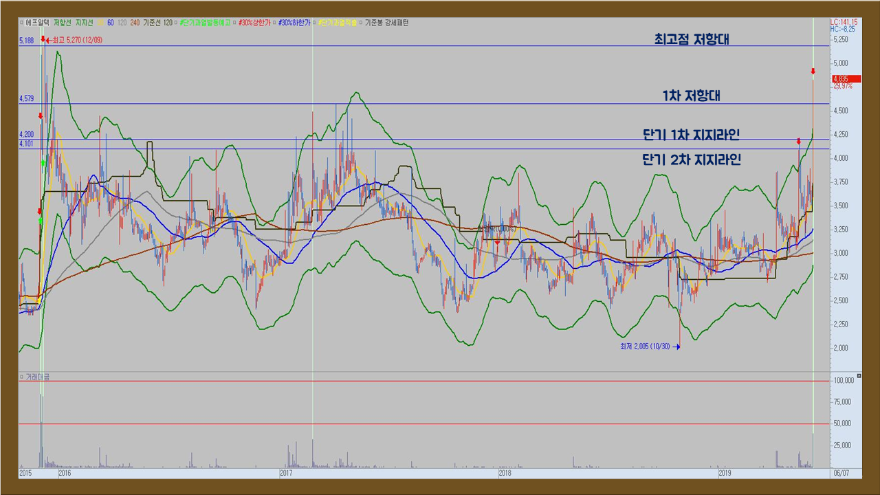 다만 위로 최고점 저항대가 존재하는데 이는 강력한 저항 대입니다. 만약 에프알텍의 주가가 최고점 저항대를 강하게 돌파한다면 추가 상승할 가능성이 있으나 그렇지 않다면 하락 추세로 돌변할 가능성이 높으니 투자에 신중을 기해야 합니다.