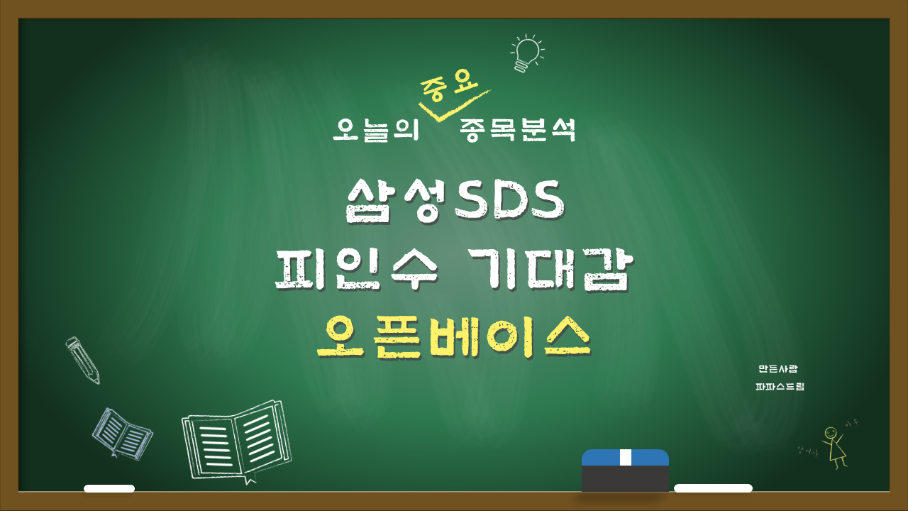 이에 오픈베이스가 삼성 SDS에 피인수될 가능성이 있다는 판단에 주가는 급등한 것으로 풀이됩니다. 이것은 명확하게 밝혀진 사유가 아닌 선전지 혹은 시중에 나와있는 정보를 취합하여 제가 판단한 것으로 실제 사실과는 다를 수 있으니 참고만 해주시면 좋겠습니다.