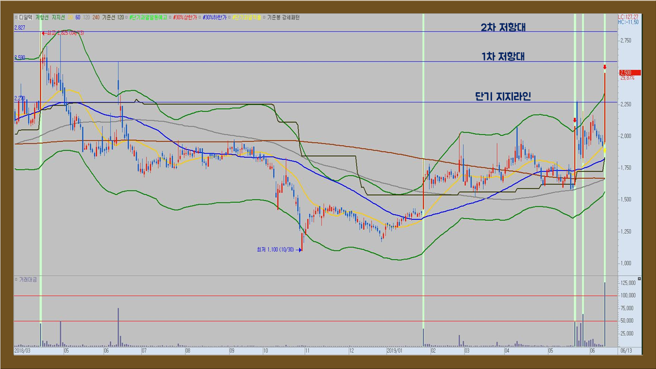 디알텍 주가의 1차 저항대 가격은 3590원 부근이며, 2차 저항대 가격은 2830원 부근입니다. 단기 지지라인 가격은 2270원 부근으로 보이니 참고하시면 좋겠습니다.
