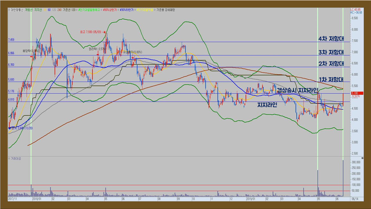 만약 월요일 대한광통신의 주가가 갭상승하여 시작한다면 차트상의 갭상승시 지지라인이라고 표시해놓은 부근에서 지지 후 급등할 가능성이 있습니다. 또한 대한광통신의 주가가 조금 더 눌림 조정을 해서 120일 이동평균선까지 하락해 준다면 좋은 매수기회가 될 수 있으니 참고하시면 좋겠습니다.