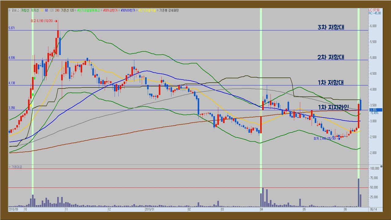 모비스 주가의 1차 지지라인 가격은 직전 고점과 120일 이동평균선, 240일 이동평균선이 만나는 가격인 3350원 부근입니다. 1차 저항대 가격은 4140원 부근, 2차 저항대 가격은 4940원 부근, 3차 저항대 가격은 5870원 부근이니 투자에 참고하시면 좋겠습니다.