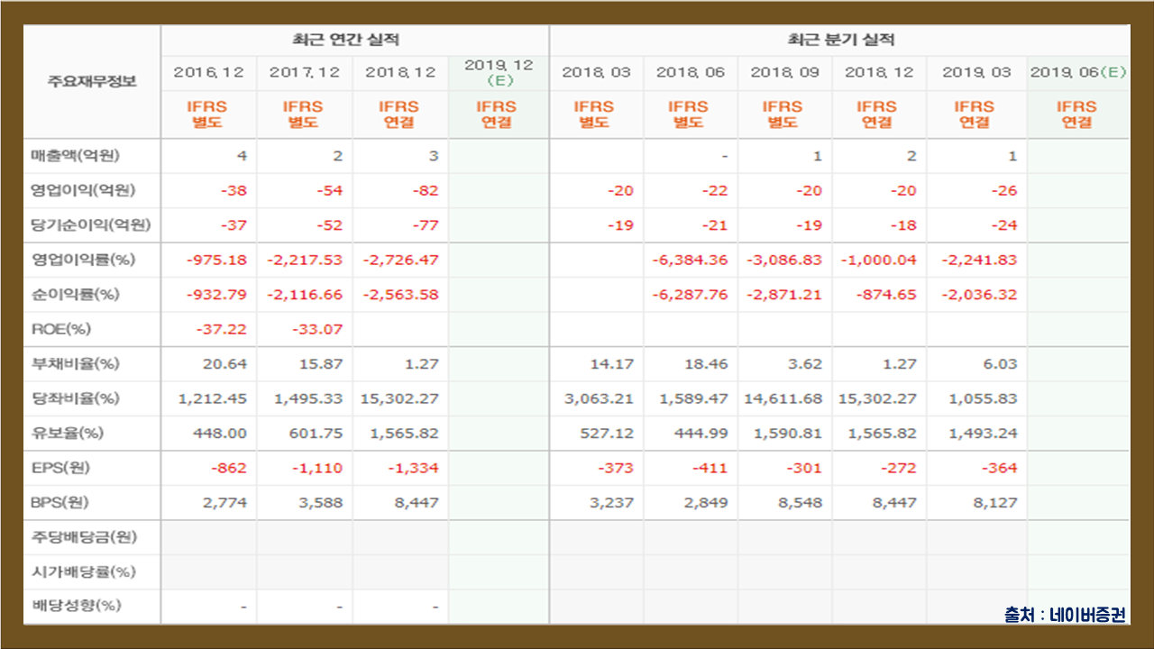 전년도 기준 매출액은 3억 원, 영업이익은 -82억 원, 당기순이익은 -77억 원을 기록하였습니다. 유보율 1565.82% 대비 부채비율은 1.27%로 재무안정성은 우수한 편이니 투자에 참고 바랍니다.