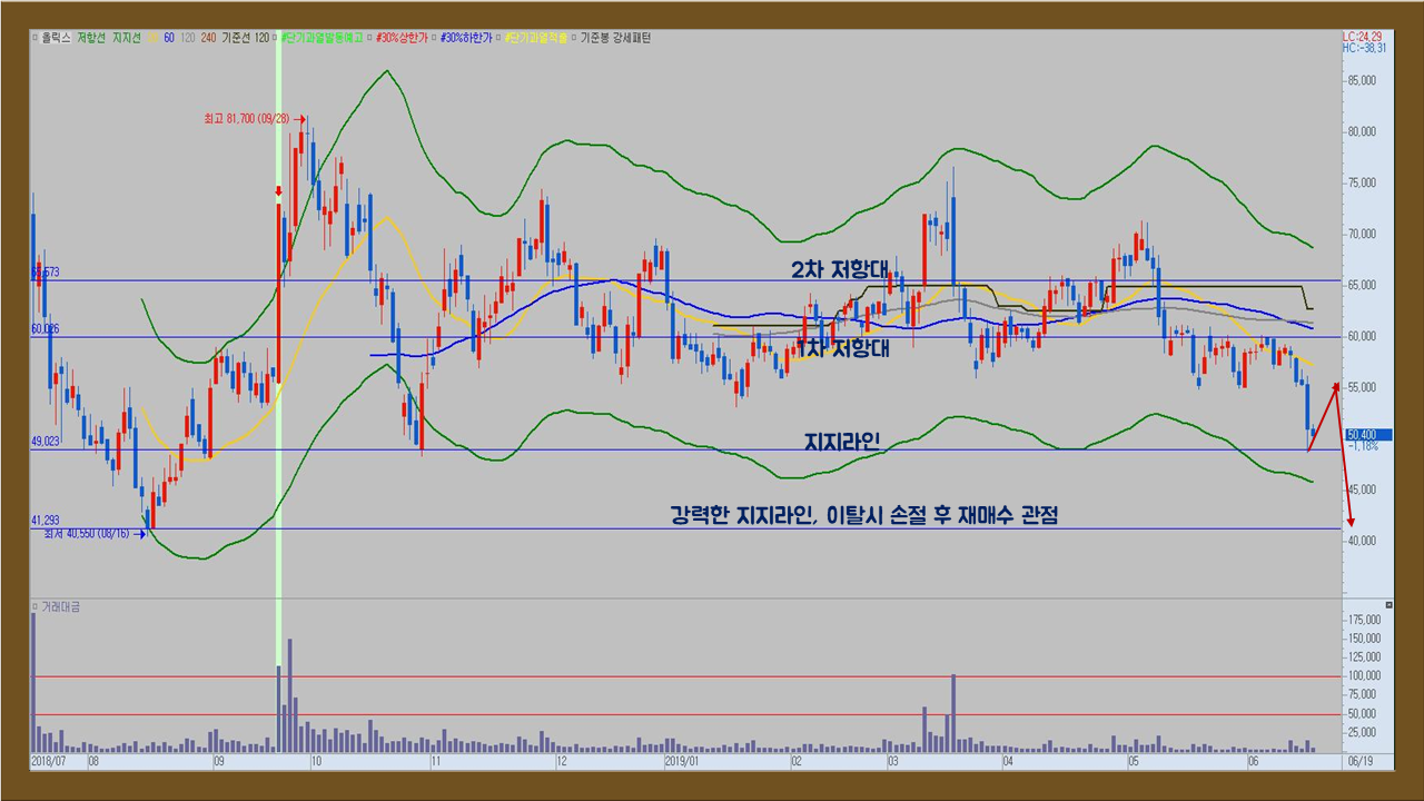 올릭스 종목에 신규투자를 원하시는 분들은 올릭스의 주가가 지지라인을 이탈하여 강력한 지지라인 가격 때까지 하락한다면 그때 매수하여 되돌림 반등을 노려보는 것도 괜찮은 방법이라 생각되니 참고 바랍니다.