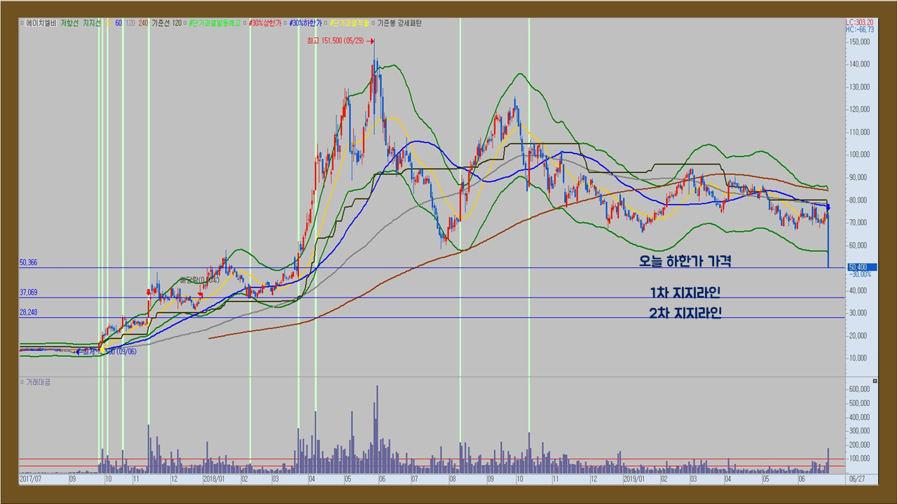 아래는 에이치엘비의 일봉차트입니다. 하한가를 기록한 오늘 가격아래로 지지라인이 위치해 있는 것을 확인할 수 있습니다.