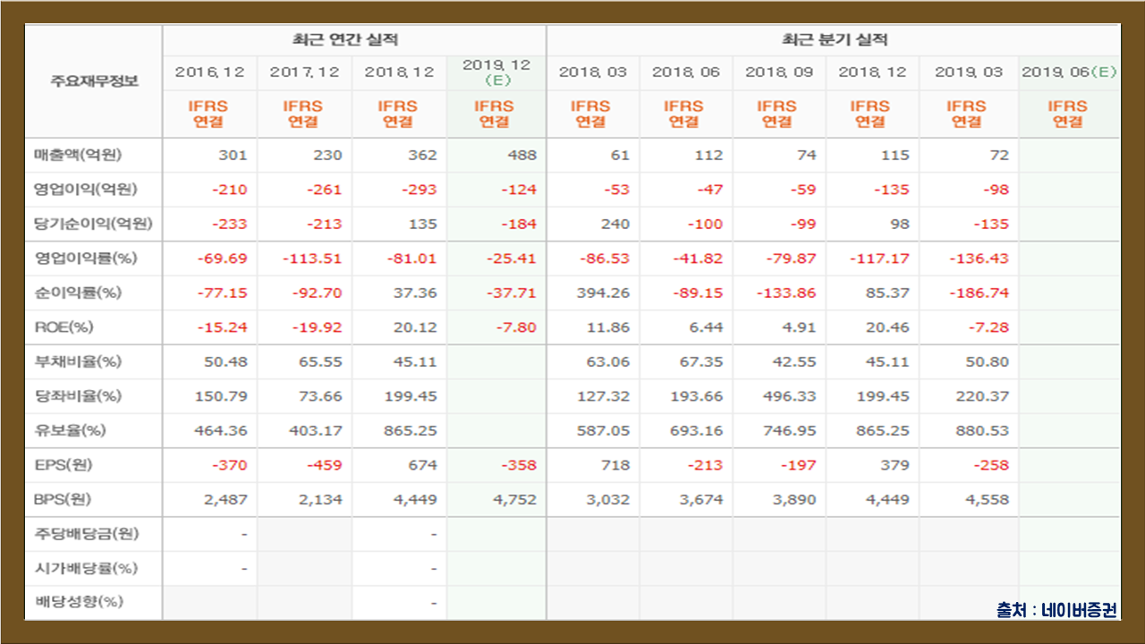 전년도 기준 매출액은 362억원, 영업이익은 -293억원, 당기순이익은 135억원을 기록하였습니다. 유보율 865.25% 대비 부채비율은 45.11%로 재무안정성은 우수한 편입니다만 앞으로의 전망은 어둡습니다.