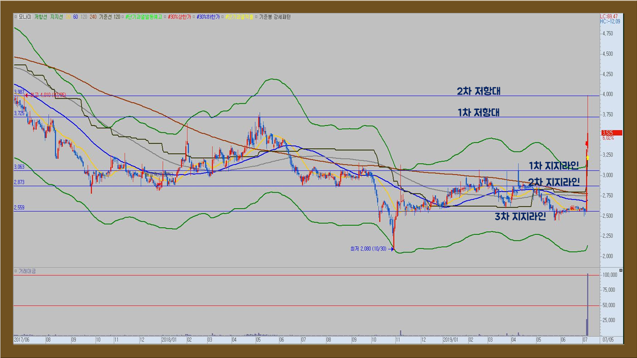 위에서 언급하였듯이 이번 이슈로 저는 추가상승을 기대하지는 않고 있습니다. 이번 상승의 의미는 모나미 종목에 세력들이 들어왔다, 정도로만 생각을 하고 있고요. 위에서 언급한 시나리오 대로 움직여 준다면 3차 지지라인 부근에서 매수해서 장기간 보유하는 전략으로 접근해볼 생각입니다.