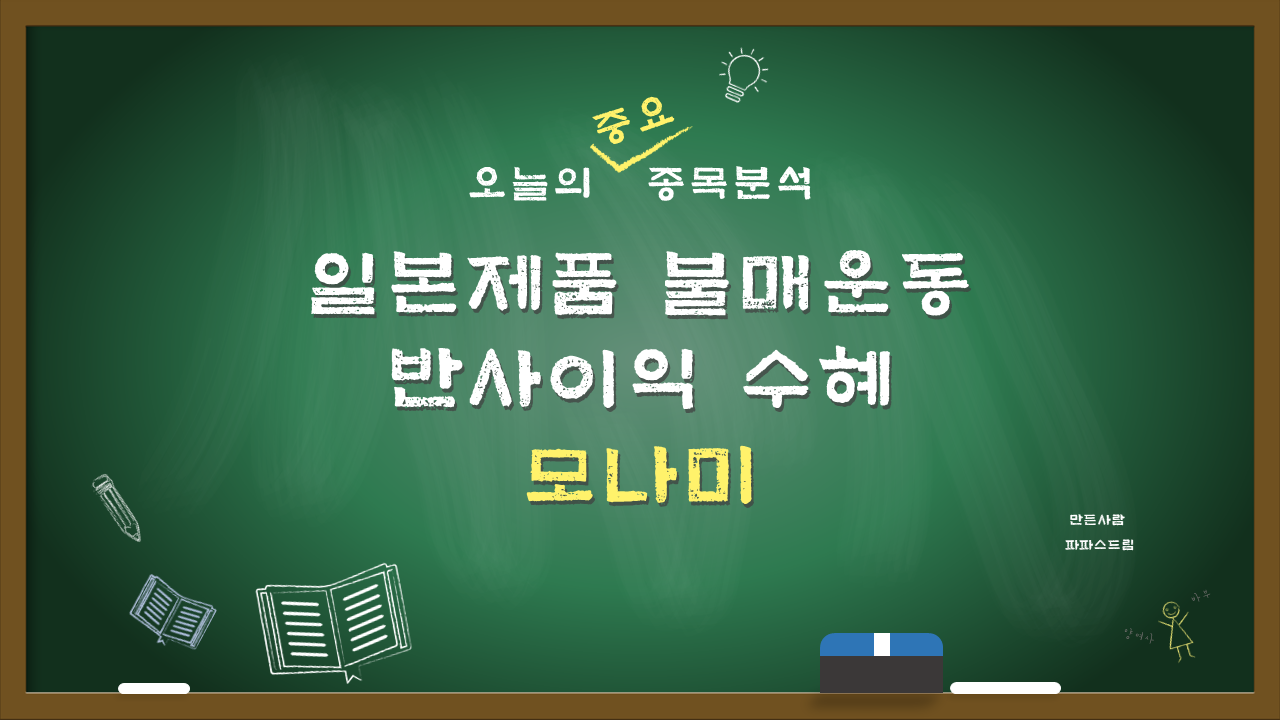 안녕하세요, 파파스드림입니다. 오늘은 우리나라에서 퍼지고 있는 일본 불매운동의 반사이익 수혜 기대감으로 급등한 모나미의 주가 전망에 대해 이야기해보도록 하겠습니다.