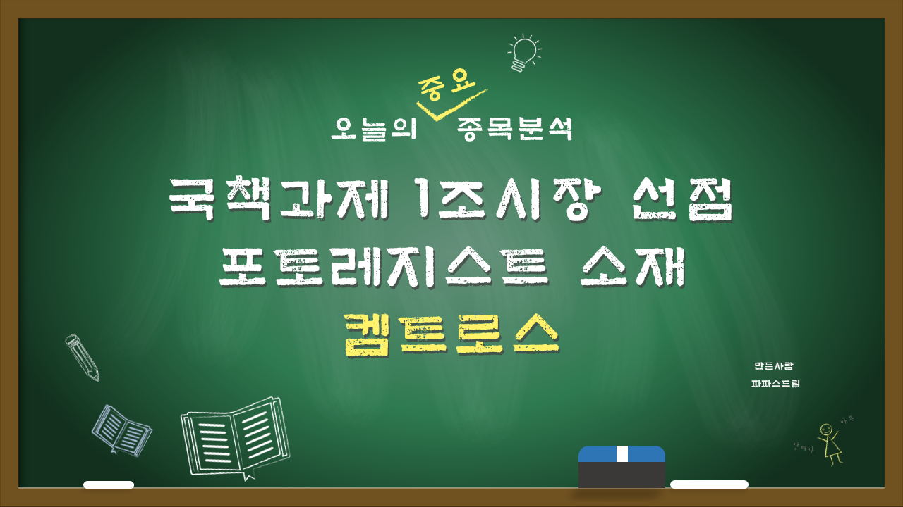 안녕하세요, 파파스드림입니다. 오늘은 일본 수출규제 확대 우려에 포토레지스트 핵심소재 생산 능력을 보유하고 있다는 사실이 부각되어 급등한 켐트로스의 주가 전망에 대해 이야기 해보도록 하겠습니다.