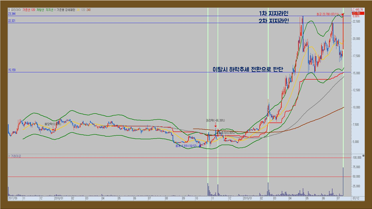 제 주관적인 의견으로는 유티아이의 주가 상승 핵심은 1차 지지라인을 지지하는가의 여부라고 생각합니다. 만약 1차 지지라인과 2차 지지라인을 지지 하지 못한다면 유티아이의 주가는 이번 상승파동으로 여기까지라고 생각하고 투자접근을 하지 않는것이 좋을 거 같습니다.