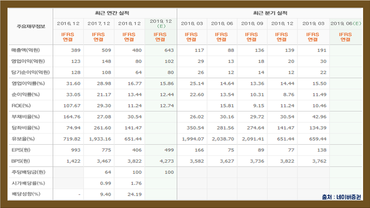 유티아이의 재무정보입니다. 19년도 1분기 매출액은 191억원, 영업이익은 30억원, 당기순이익은 22억원을 기록하였습니다. 영업이익률이 무려 15.56%나 되네요. 유보율 651.44% 대비 부채비율은 30.54%로 재무안정성은 우수한 편이니 참고바랍니다.