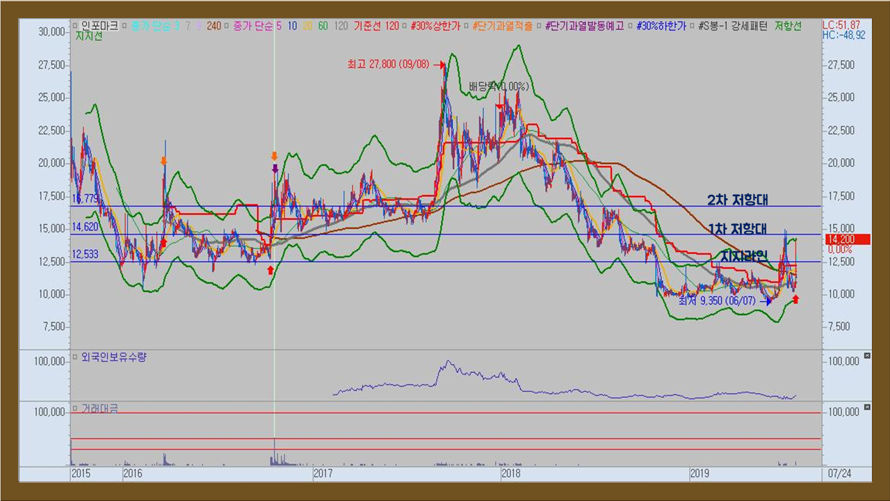 인포마크는 지난 2015년 9월, 공모가 14,000원으로 코스닥 시장에 상장되었는데요. 오랜 가격조정과 기간조정으로 9,350원까지 주가가 하락하여 바닥을 다진 후 상승하려는 움직임을 보이고 있습니다. 앞으로 인포마크의 주가는 어떻게 움직일 지 한번 알아보도록 하겠습니다.