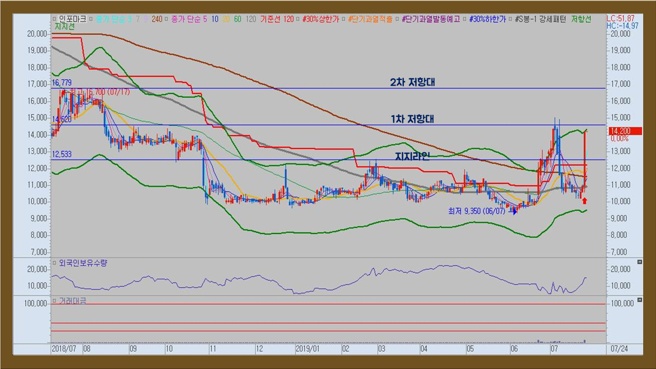 인포마크의 주가는 인공지능 관련 사업의 다양화를 추진하겠다는 소식으로 급등하여 상한가를 기록하였습니다. 바닥권에서 나온 호재이슈와 더불어 인포마크의 주가 역시 상승반전을 꽤하는 모습으로 판단되니 관심종목에 편인 후 지속적인 관찰이 필요한 종목이라 하겠습니다.