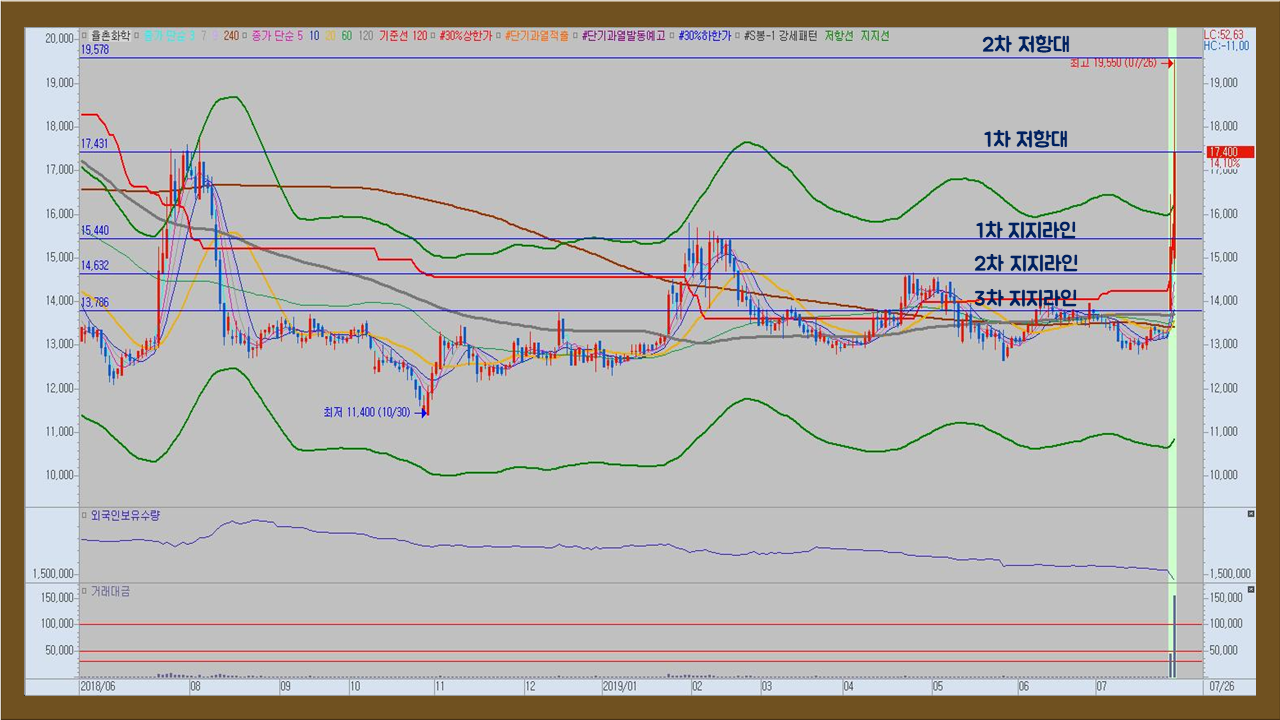 차트상에서 보이는 것과 같이 현재 율촌화학의 주가는 바닥을 다진 후 상승하고 있습니다. 지난 2017년 11월 급등 후 약 1년 6개월간 가격조정과 기간조정을 보인 후 상승하였는데요. 율촌화학의 주가는 보유한 호재대비 주가는 바닥권이라 판단되기 때문에 추가상승할 가능성이 있습니다.