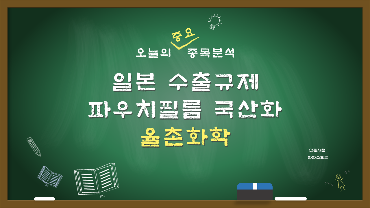 율촌화학은 일본의 한국 경제 재제 및 수출규제가 장기화 및 악화될 전망에 일본산 의존도가 높은 배터리 파우치필름을 국산화하기 위해 LG화학 및 삼성SDI등이 국내 제조사들과 접촉했다는 사실이 알려지며 급등하였습니다.