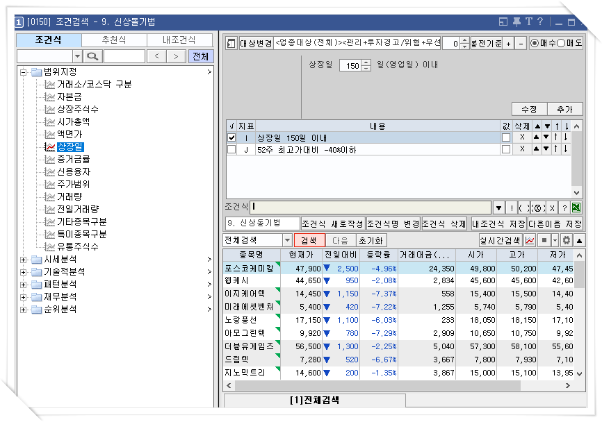 먼저 조건검색 화면 번호인 0150을 눌러 조건 검색식 화면을 띄웁니다. 그리고 좌측 상단의 조건식을 클릭 후 상장일을 더블 클릭합니다. 그리고 상장일 옆에 있는 숫자를 변경해서 저장하면 오늘로부터 해당하는 날짜까지 신규상장된 주식이 검색으로 나오게 됩니다.