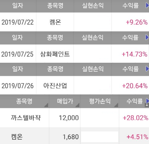 위의 3종목은 매도가 완료된 종목이고 밑의 두 종목은 현재 보유하고 있는 종목입니다. 켐온, 아진산업은 제 블로그에 제가 대응방법을 적어드렸었고 삼화페인트는 차트를 돌려보다 제가 주로 사용하는 단기매매 패턴에 맞겠다 싶어 매매한 종목입니다.