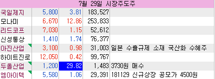 이번 하락장에서 주도주는 일본 수출규제 반사이익 수혜주들이었습니다. 아진산업, 삼륭물산, 모나미, 켐트로스, 삼화페인트, 솔브레인등의 종목을 매매하였다면 괜찮은 수익을 얻을 수 있었을 것입니다.