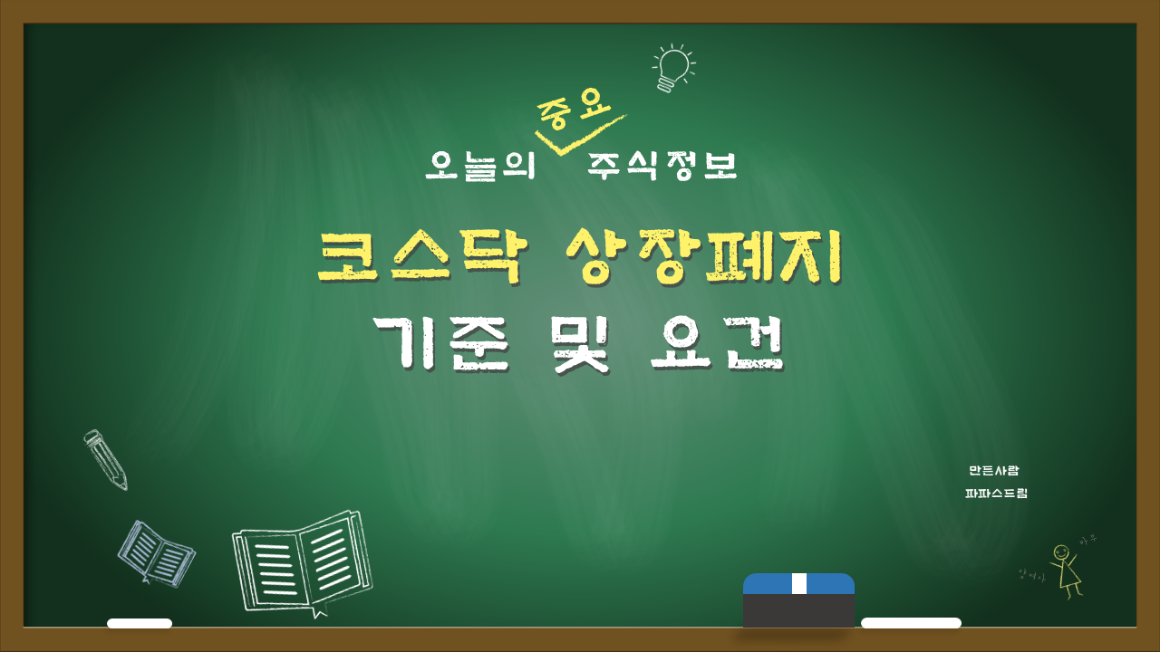지금까지 코스닥 상장폐지 기준 및 요건에 대해 알아보았습니다. 오늘도 행복한 하루되세요. 감사합니다.