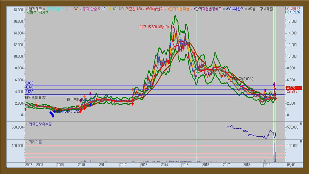 일지테크 주가의 1차 저항대 가격은 5,000원 부근이며, 차트상의 단기매매 지지라인, 7월 10일의 종가는 4,270원 부근이니 참고바랍니다.