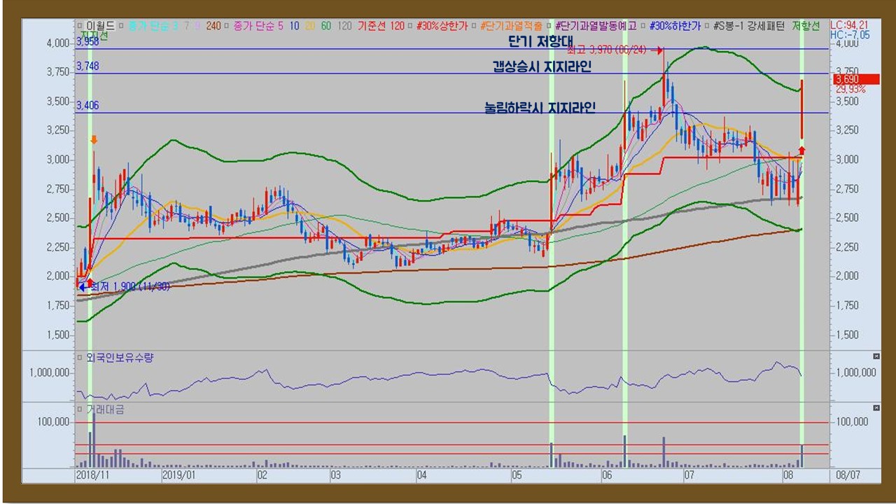 이월드 종목을 저점에서 매수하여 수익이신 분들은 본인의 투자원칙에 따라 익절라인을 설정 후 대응하시면 좋겠습니다. 이월드의 기본적인 주가흐름은 상승이라고 판단되나 미-중 무역전쟁, 원달러 환율 상승, 중국 환율조작국 지정등의 글로벌 악재의 상황에 따라 실제 주가의 움직임은 다르게 움직일 수 있으니 반드시 실제 주가를 확인하면서 대응하시길 바랍니다.