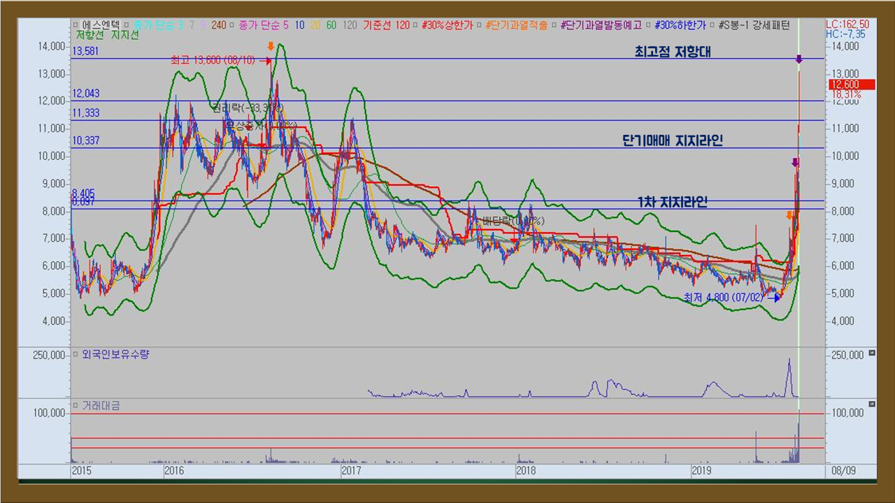 단기간 약 180% 이상 주가가 급등한 것과 일본 수출규제 관련주들의 1차 렐리는 끝났다는 점, 에스엔텍의 주가가 전고점 부근에 위치해 있다는 것 등이 하락조정을 예고하고 있다고 판단되니 가급적 신규투자는 지양하는 것이 좋겠습니다.