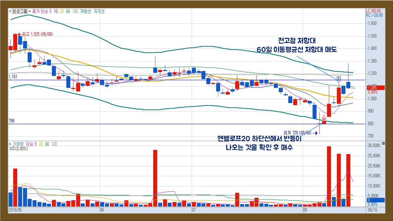 최근 상승부분만 확대한 차트입니다. 제가 저점을 잡는 방법은 심플합니다. 상승할 가능성이 있다고 생각되는 종목이 엔벨로프 20하단선에 지지할때 파동상 저점이라 판단하고 있습니다.