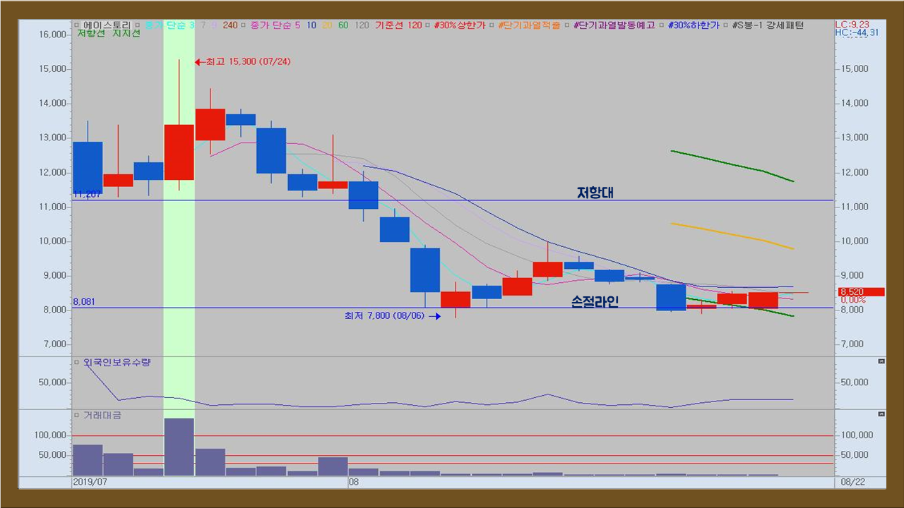 현재 에이스토리 종목은 고점에서 매수하여 손실이신 분들은 본인의 투자원칙에 따라 홀딩여부를 결정하셔야 할 것 같습니다. 8080원을 손절라인으로 설정 후 매수평단가를 11000원 이하로 맞추는 것도 좋은 전략입니다만 이건 본인 스스로의 판단으로 결정해야할 부분이라 생각됩니다. 모쪼록 큰 손실없이 빠져나오시길 바랍니다.