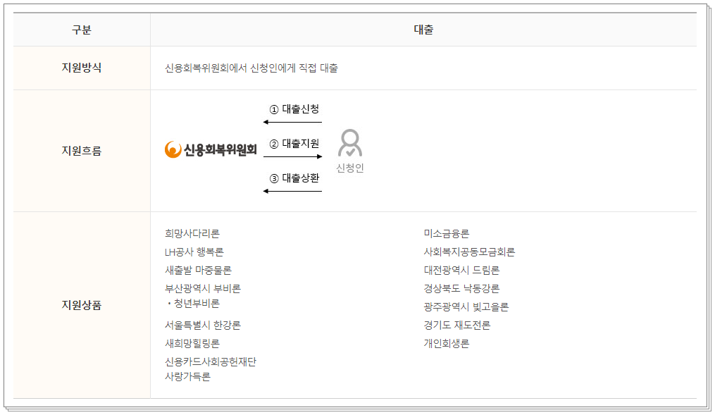 신용회복위원회의 소액금융제도에는 신용회복위원회가 직접 자금을 대여하는 대출방식과 신청인이 금융회사로부터 대출을 받을 수 있도록 신용보증을 제공해 주는 방식으로 진행됩니다.
