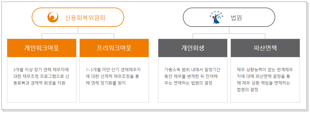 그 중 서민들이 가장 쉽게 이용할 수 있는 채무조정제도는 신용회복위원회의 채무조정제도입니다. 사전채무조정제도라고도 이야기 하는데요. 1개월 이상 3개월 이하 단기 연체채무자가 신청할 수 있는 프리워크아웃 제도와 3개월 이상 연체하신 분들만 신청할 수 있는 개인워크아웃제도가 있습니다.