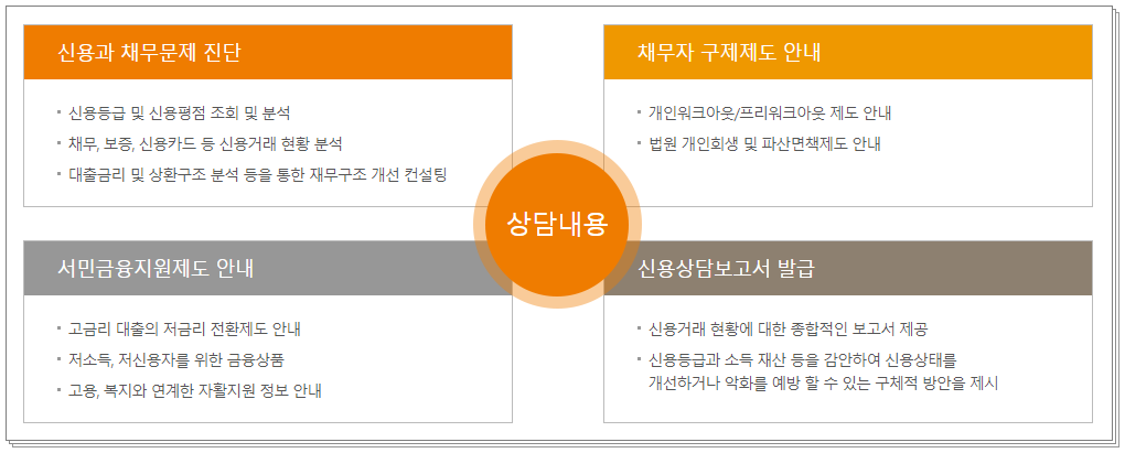 신용회복위원회는 서민들의 신용종합상담을 지원하고 있습니다. 신용회복위원회에 방문하시면 신용등급 및 신용평점 조회 및 분석, 채무, 보증, 신용카드등 신용거래 현황분석, 대출금리 및 상환구조 분석등을 통한 재무구조 개선 컨설팅을 받을 수 있습니다.