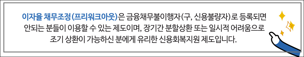 이자율 채무조정이라고도 불리는 채무조정은 금융채무불이행자로 등록되면 안되는 분들이 이용할 수 있는 분이며, 장기간 분할상환 또는 일시적 어려움으로 조기 상환이 가능한 분에게 유리한 채무조정제도입니다.