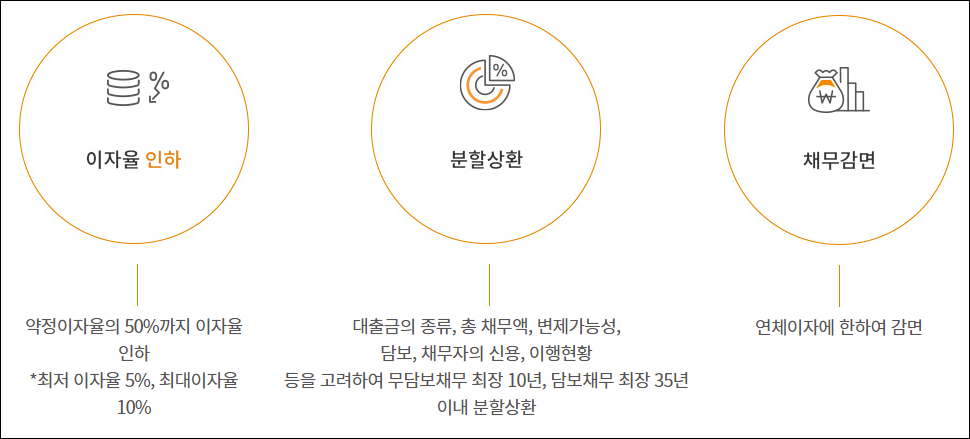신청시 필요한 비용은 5만원이며, 이자율 인하, 분할상환, 채무통합, 연체이자 감면등의 혜택을 받을 수 있습니다.