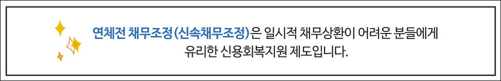 신속채무조정은 연체전 채무조정이라고도 불리우며, 일시적으로 채무상환이 어려운 분들에게 유리한 신용회복제도입니다.