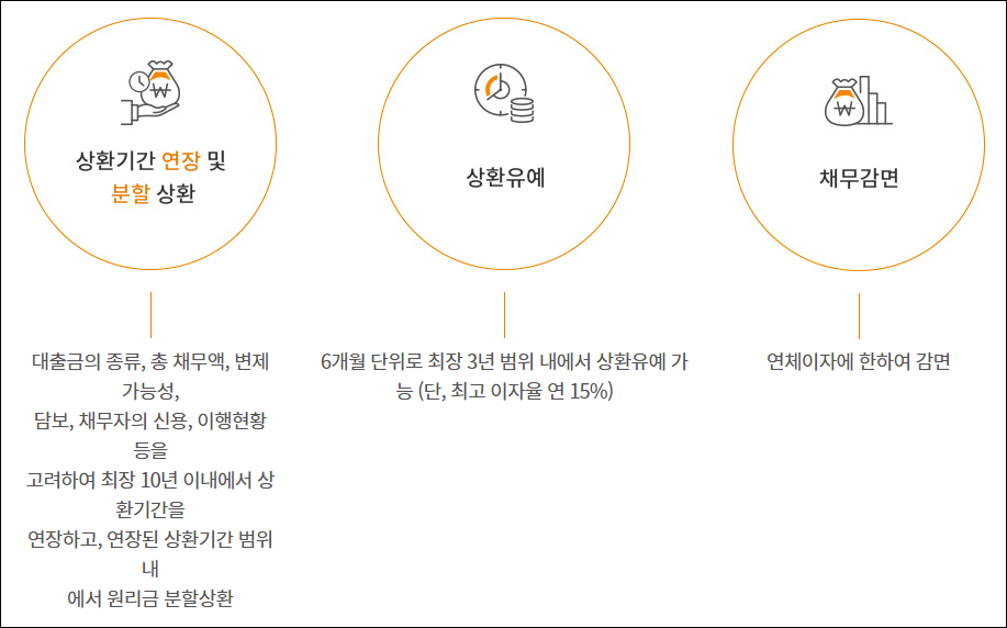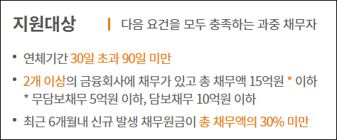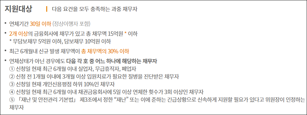 현재 대출금을 정상적으로 변제하고 있지만 휴직 및 실직, 휴업 및 폐업 등의 이유로 조만간 연체가 될 위험에 처해 있는 경우 또는 이미 연체가 시작되어 30일 이하로 연체중인 분이 신청할 수 있습니다.