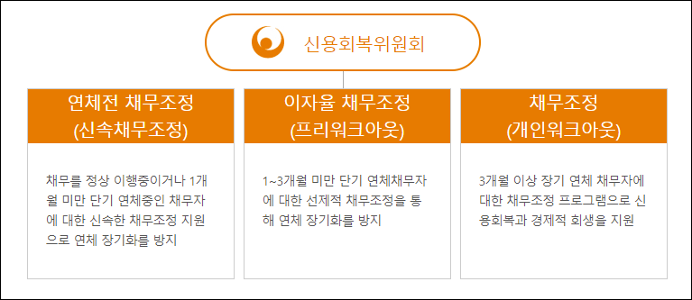 채무조정제도는 크게 신속채무조정, 이자율채무조정, 개인워크아웃 등 3종류로 나뉘어 집니다.