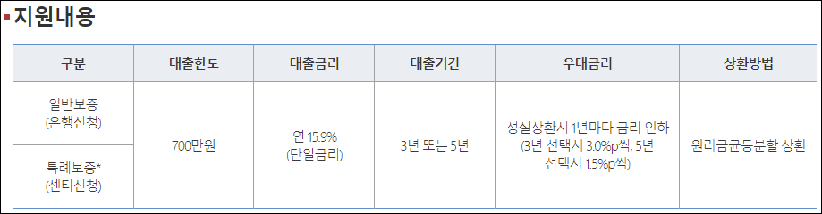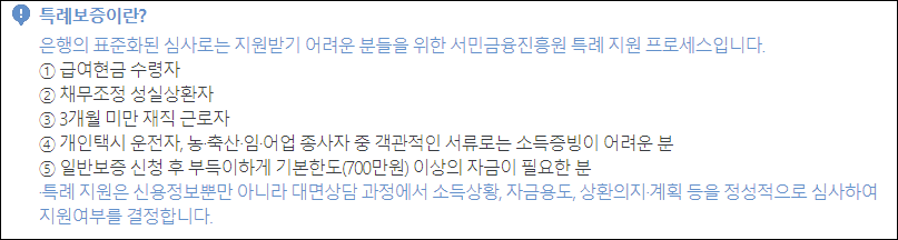 급여를 현금으로 수령하여 소득증빙이 어려운 경우, 채무조정 성실상환자, 3개월 미만 재직 근로자, 기본한도 700만원 이상의 자금이 필요한 분 등이 특례보증을 이용할 수 있으니 참고하시길 바랍니다.
