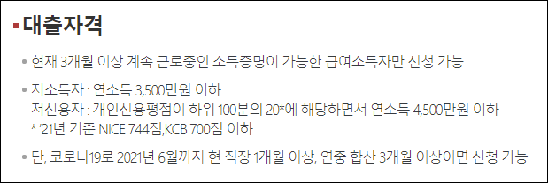 원래는 한 직장에 3개월 이상 연속하여 근무해야만 대출 대상이 되었지만 코로나19로 인해 한시적으로 현 직장 1개월 이상, 연중 합산 3개월 이상이면 신청할 수 있으니 필요시 서민금융진흥원 상담센터로 문의해보시길 바랍니다.