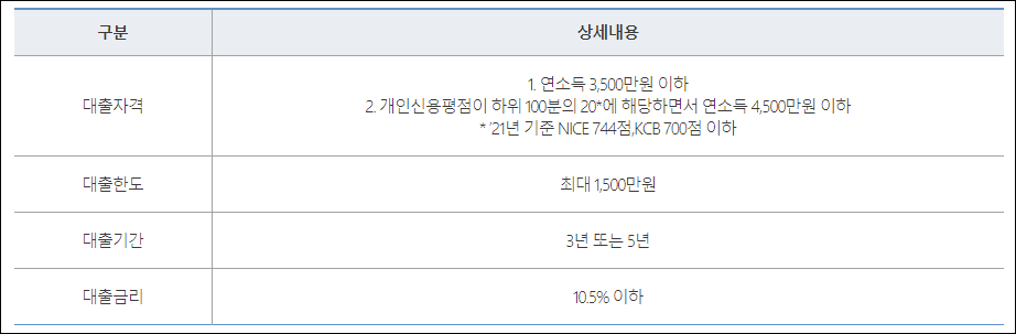 개인신용평점과 관계 없이 연간 소득 3500만원 이하인 경우와 개인신용평점이 하위 100분의 20에 해당하면서 연소득이 4500만원 이하인 경우 신청할 수 있습니다.