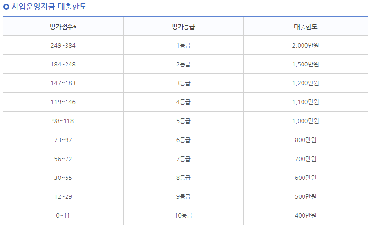 1등급의 경우 대출한도는 최대 2000만원까지이며, 10등급의 경우 최대 대출한도는 400만원이니 위의 표를 참고하시길바랍니다.