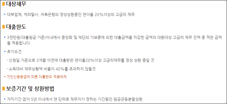 대환자금은 연 20% 이상의 고금리 대출을 이용하고 있는 경우 비교적 낮은 금리로 대환을 지원하는 상품이라고 생각하시면 됩니다.