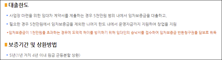 사업장 마련을 위한 임대차 계약서를 제출하는 경우에 한해 5천만원까지 지원을 받을 수 있으며, 필요한 경우 5천만원에서 임차보증금을 제외한 나머지 한도내에서 운영자금까지 지원받을 수 있습니다.