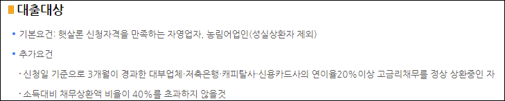 사업자 햇살론 대환대출은 기본적으로 햇살론 신청자격을 만족하는 자영업자 및 농림어업인이 신청일 기준으로 3개월이 경과한 연 20% 이상의 고금리 채무를 보유하고 있는 경우 신청할 수 있습니다.