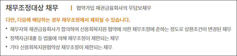 위의 지원대상 요건을 모두 충족하더라도 채무자와 채권금융회사가 합의하여 신용회복지원 협약에 의한 채무조정에 준하는 정도로 상환조건이 변경된 채무와 정책자금 대출 등 법률에 의해 채무조정에 제한되는 채무는 채무조정을 받을 수 없으니 유의바랍니다.