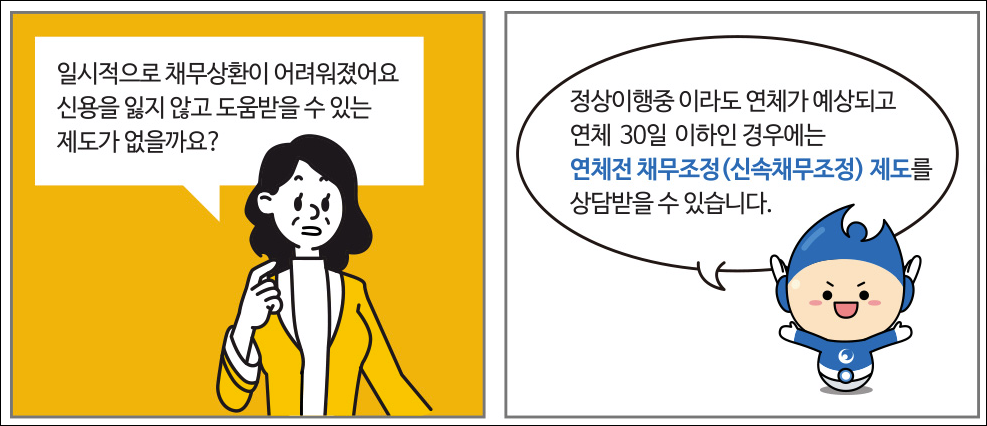 아래는 신용회복위원회 공식 홈페이지에서 제공하는 연체전 채무조정에 대한 간략한 웹툰입니다.