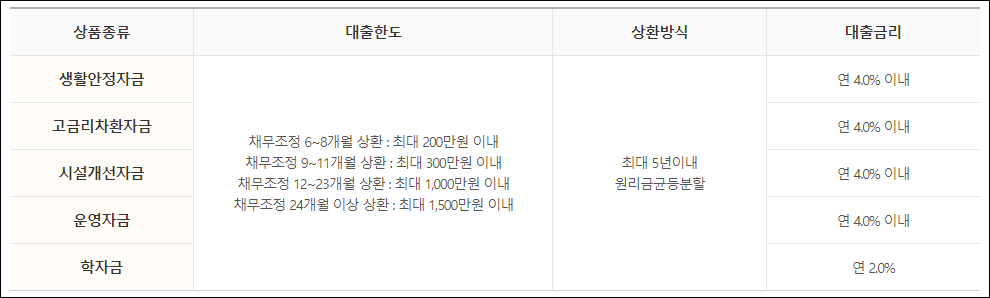 대출금리는 학자금의 경우 연 2.0% 그외 자금용도의 경우 연 4.0% 이내로 산정되니 참고바랍니다.