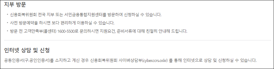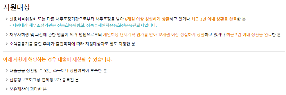 즉 신용회복위원회에서 채무조정을 진행하고 있는 분과 법원의 개인회생을 진행하고 있는 분 모두 신청할 수 있으며, 각각 6개월, 18개월 이상 변제금을 성실하게 납입해야 신청할 수 있습니다.